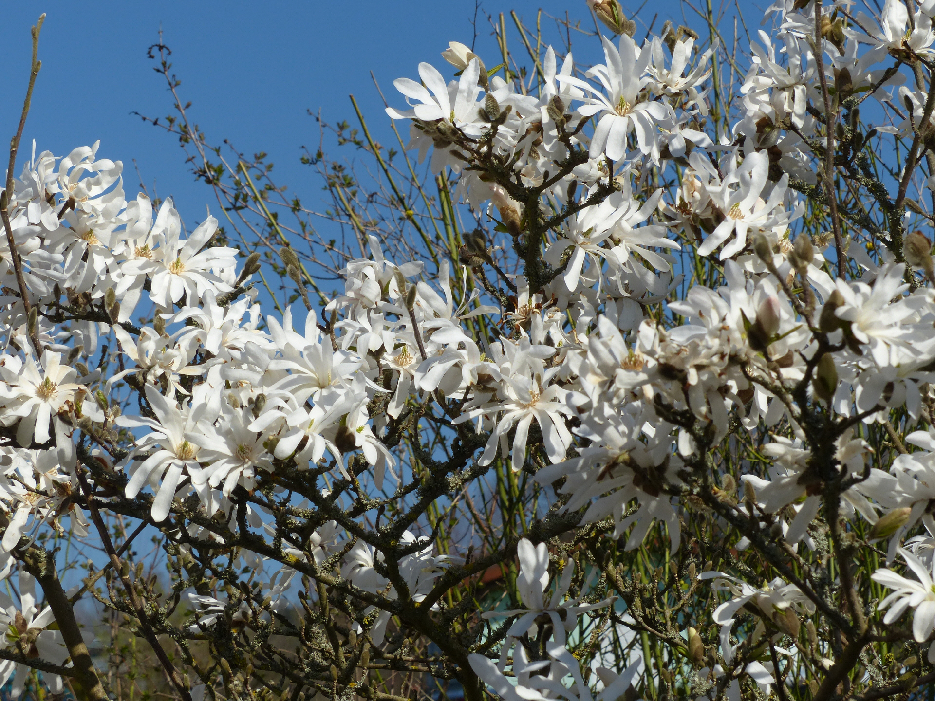 Die ersten Forsytien beginnen zu blühen. Das ist die Zeit für den Rosenschnitt. Mitte März blüht unsere Sternenmagnolie und es wird langsam wärmer. Der Pfirsich steht am 19. März 2023 in voller Blüte. Die Elfenblume zeigt ihre ersten Blüten. Der Bärlauch treibt aus.
